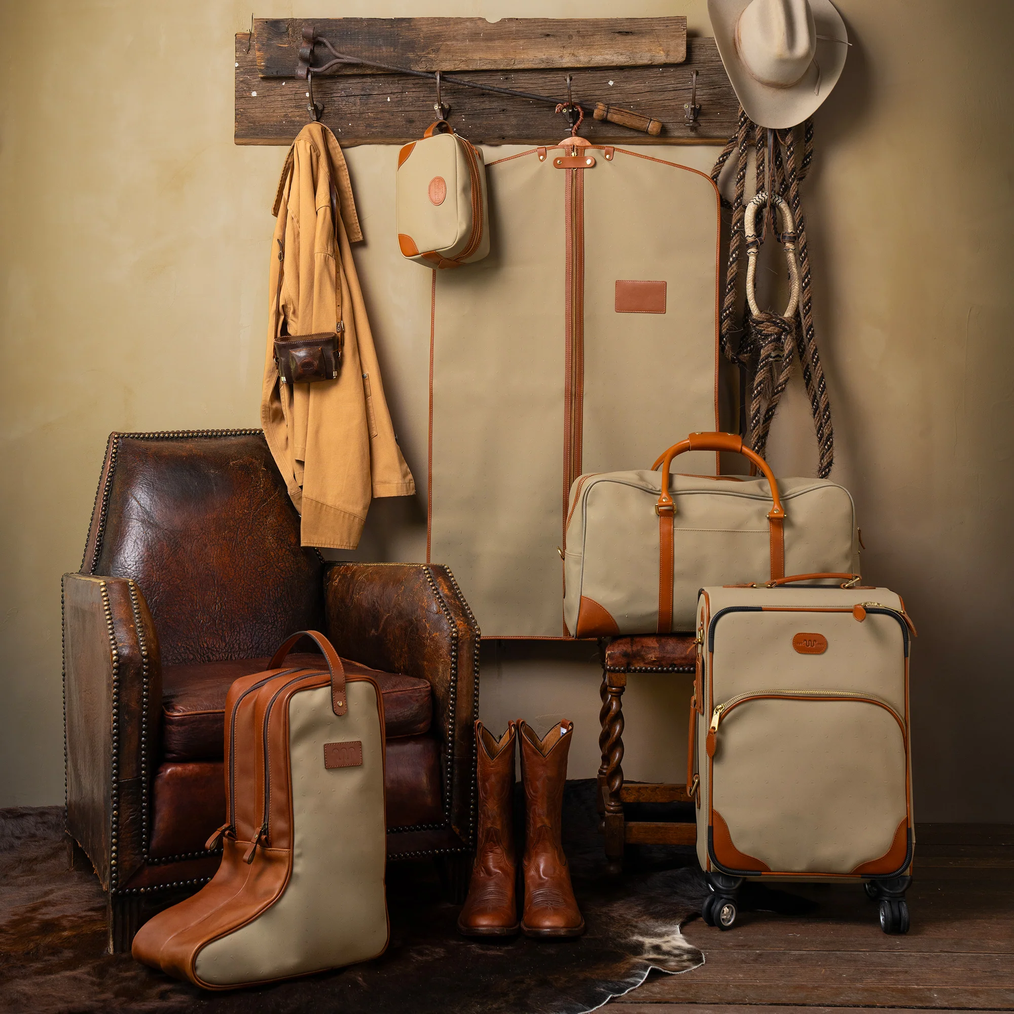 Protect your wardrobe with our signature water-resistant Armstrong canvas backed with strong Cordura® fabric and then embossed with Running W® details. It’s reinforced with naturally strong Latigo leather trim. The brass zipper front secures your garments, making it perfect for travel, whether you're heading to a cattle auction or a formal event. It pairs perfectly with the rest of the Armstrong luggage collection.
