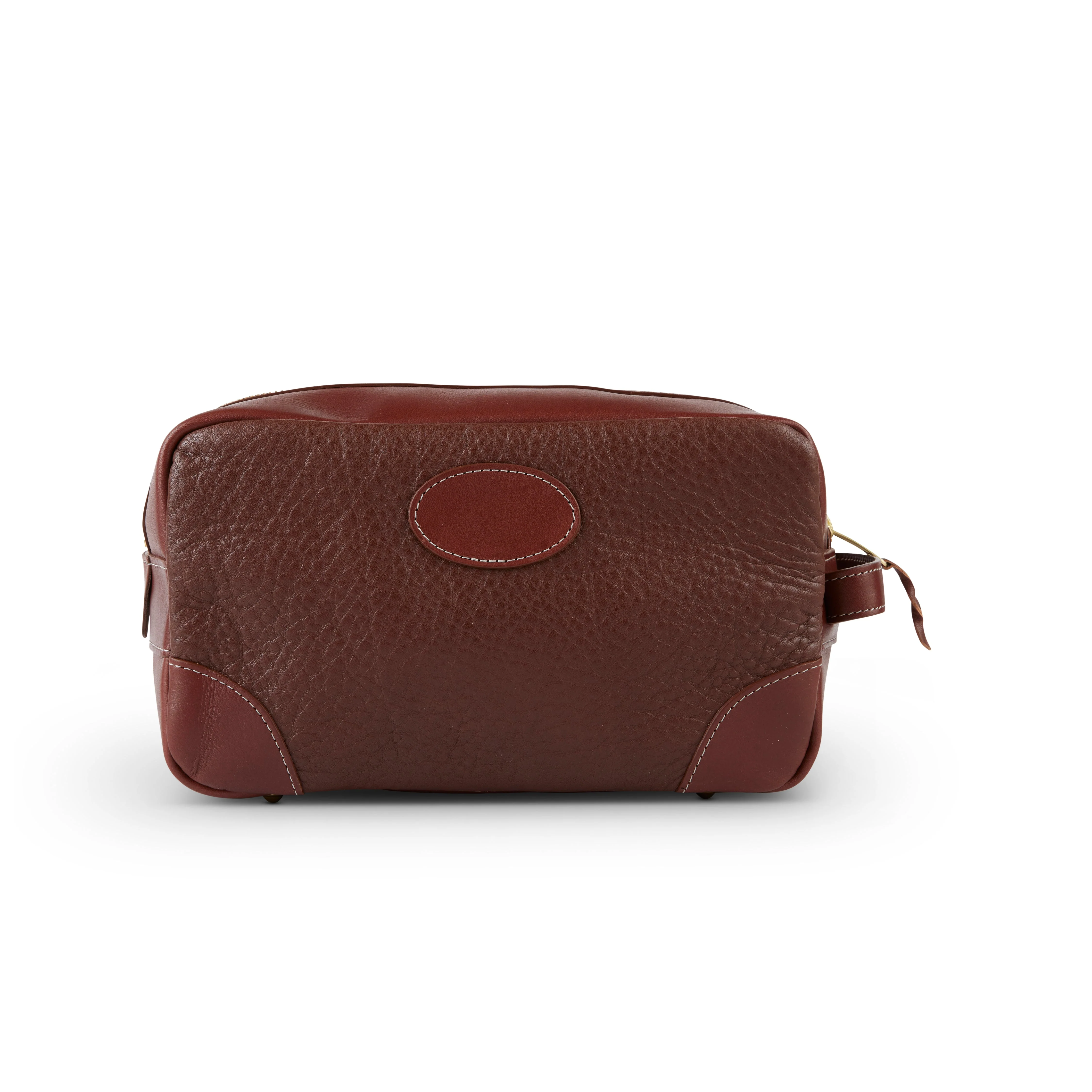 This versatile case, named in honor of Los Kineños, the people of the King Ranch, can be used as a shave case, dopp kit, makeup kit, accessories case, or camera bag. Made of King Ranch Docil leather with Latigo trim. Saddle Latigo leather bottom features brass feet. Full zippered top and side handle. 10" x 4 1/2" x 6".