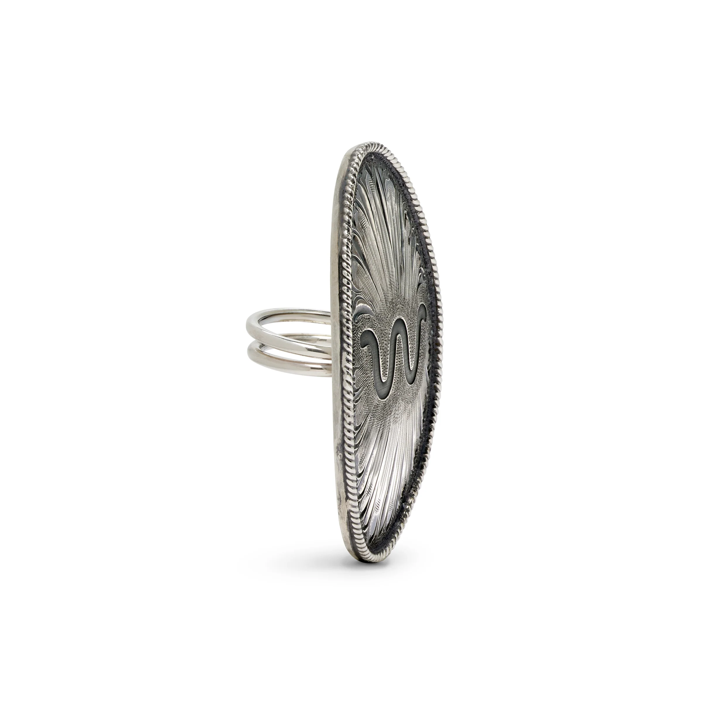 This elegant scarf slide is the result of a rare collaboration between King Ranch and master silversmith Clint Orms. Handcrafted in solid sterling silver in limited quantities, the design centers on an artful Running W surrounded by Orms’ signature hand-cut scrollwork. Refined over decades, brings softness and depth to the silver, with hand-engraved lines that catch the light.
