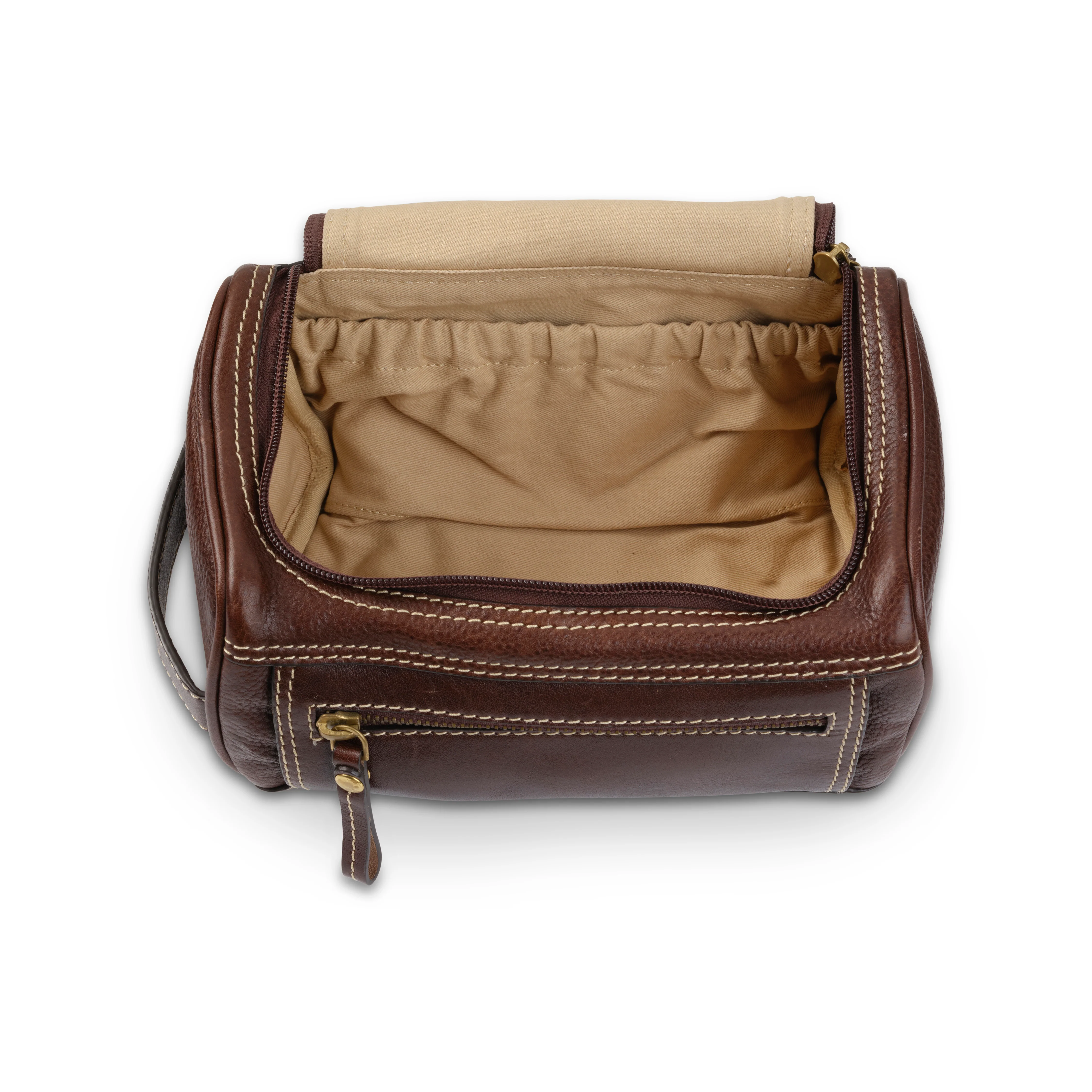 A refined travel essential, this compact dopp kit from the timeless Laureles Collection brings craftsmanship to your daily routine. Made from rich, full-grain cowhide with a pebbled grain body, it features a top flap zip closure, front zip pocket, and interior elastic slit pocket to keep toiletries secure and organized. Finished with solid brass hardware, it will weather years of travel and adventures to come.