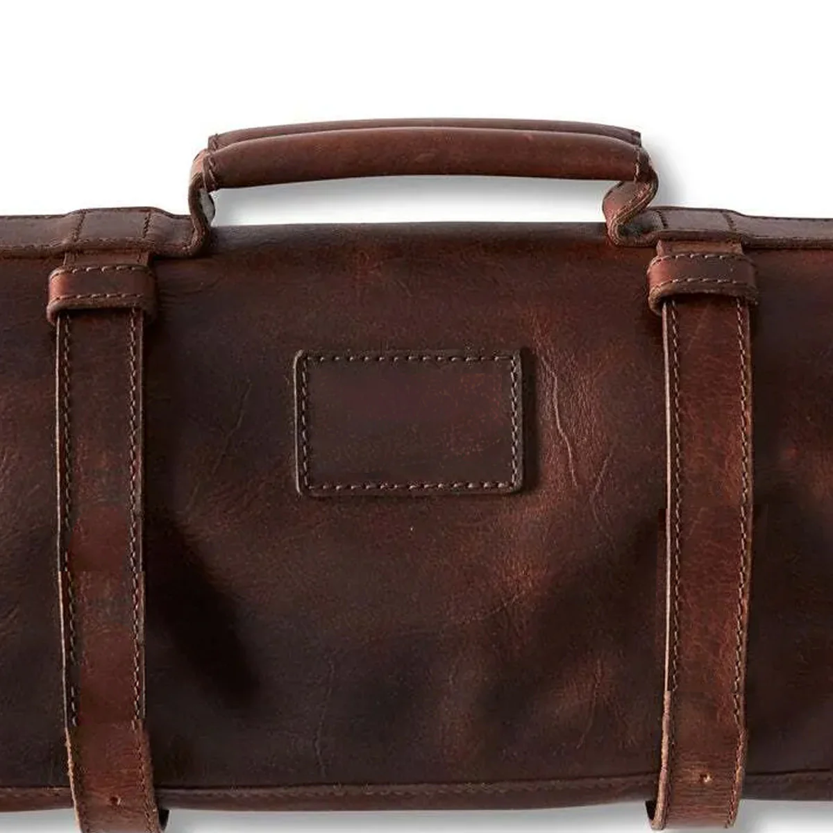 A must-have for every professional Ranch chef. Crafted with meticulous attention to detail, this knife roll combines functionality with timeless elegance, ensuring your knives are organized and secure. The interior features eight compartments, providing ample space to keep your knives perfectly placed and easily accessible. When it is time to transport your tools, simply roll it up and secure it with the two leather straps. Made from resilient leather, this knife roll is built to withstand the rigors of daily use in the hot kitchen while aging beautifully over time. It is not just a tool—it is a statement of craftsmanship and heritage, perfect for any chef who values quality and style.