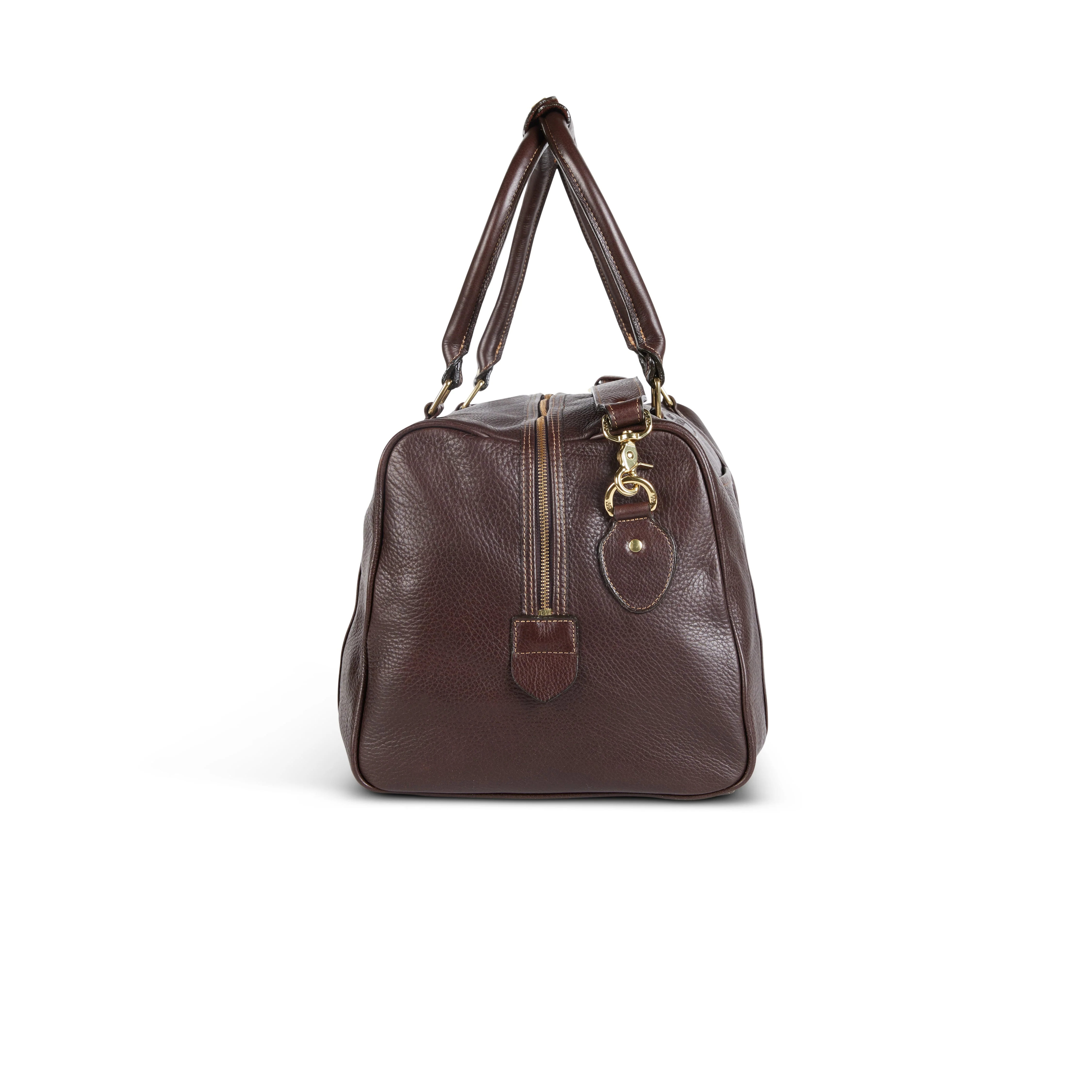 Elevate your travel experience with our essential duffle bag, crafted from premium American cowhide leather. It combines utilitarian functionality with luxurious aesthetics, making it an essential companion for day trips or as a small carry-on piece. The detachable strap and solid brass hardware enhance its durability and style, while the strong straps provide extra support for all your essentials. The bag features a brass two-way zipper for easy access, two flat open pockets on the outside for quick-grab items, and one zippered pocket along with two flat pockets inside for organized storage. An oval plaque allows for personalization with up to three initials, adding a personal touch to or making it a perfect present.