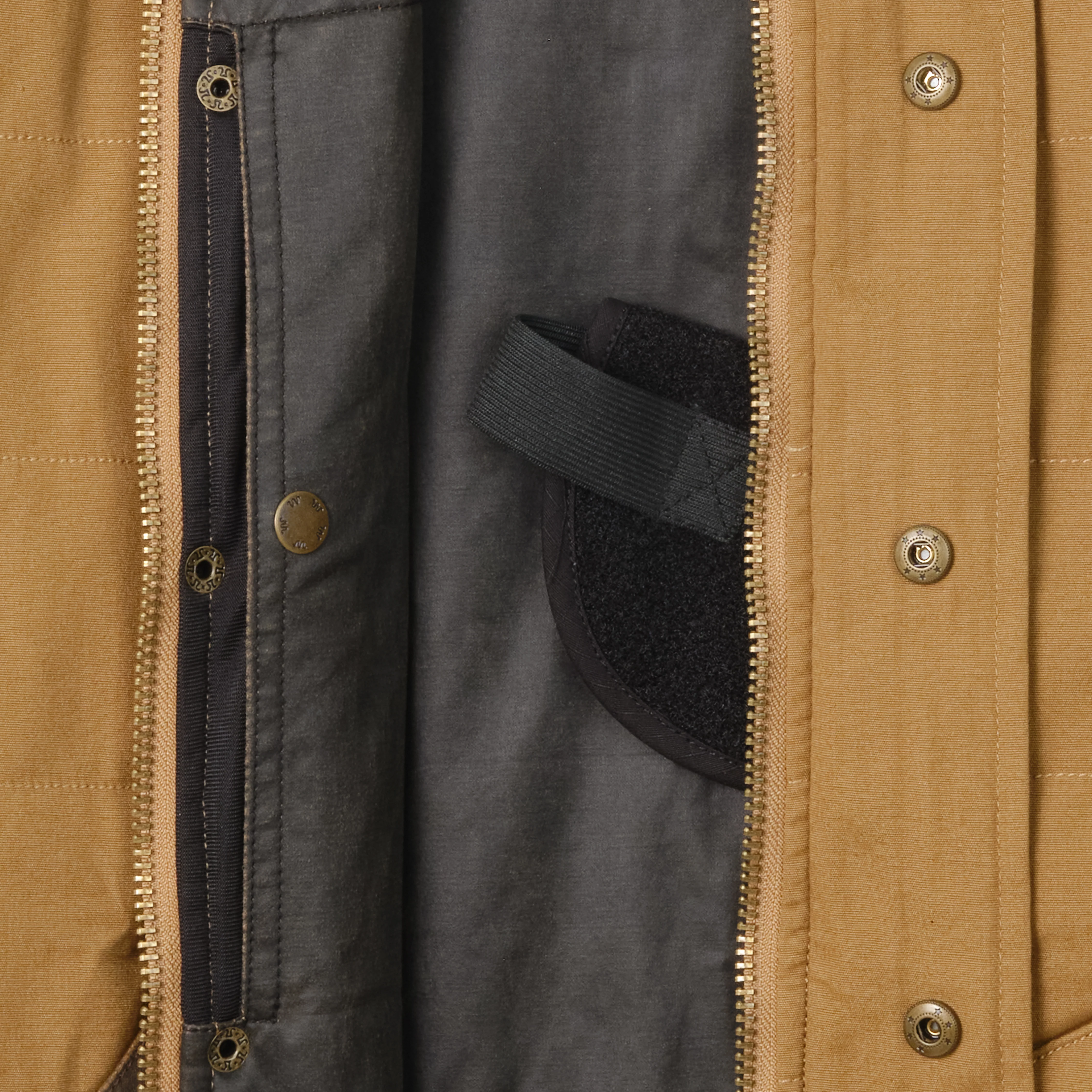 Intentionally crafted for utility and everyday wear, this concealed carry jacket combines rugged canvas with thoughtful details for the outdoorsman. A Velcro holster system inside allows you to securely position your firearm on either side, while the classic exterior keeps the look understated and versatile. The jacket features a front zip closure with antique brass hardware, snap cuffs, and western yoke detailing that nods to King Ranch heritage. Multiple exterior pockets offer storage for essentials, and a soft lining adds comfort through the colder months.