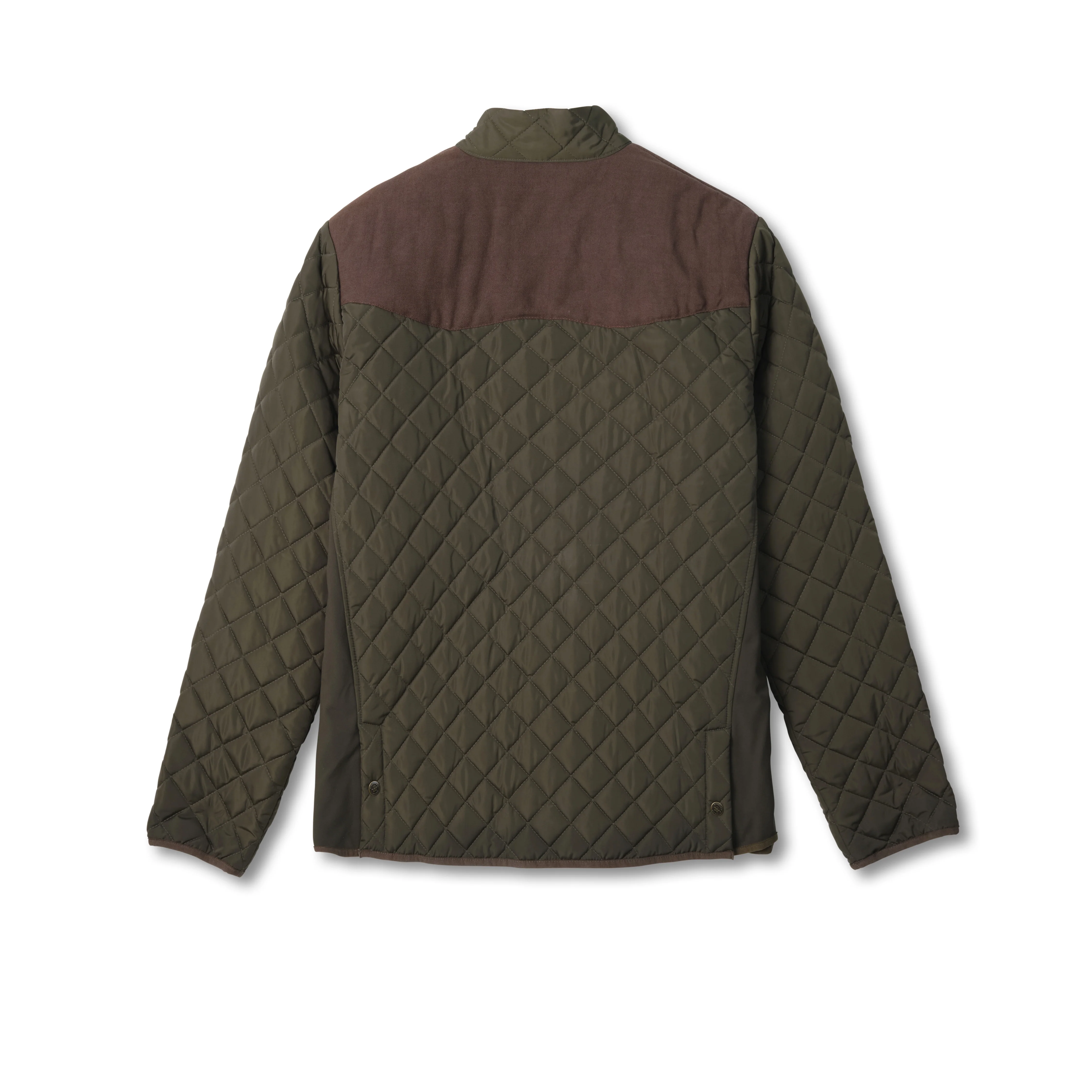 Purpose-built for the uplands, this jacket pairs lightweight warmth with the freedom to move through cover or mount your shotgun without restriction. The shell combines water-repellent quilted nylon with durable waxed canvas pocket overlays, giving it both sporting function and refined field style. Stretch side panels add ease for active pursuits, while snap-closure hem vents at the back open for even greater mobility. The stand collar helps block wind, and a softfill insulation keeps the chill at bay without adding unnecessary weight. Finished with brass-finish snaps, a ladder hook at the neck, and a discreetly embroidered Running W on the hand pocket, it’s a polished yet practical layer for crisp mornings in the field or cool evenings around camp.
