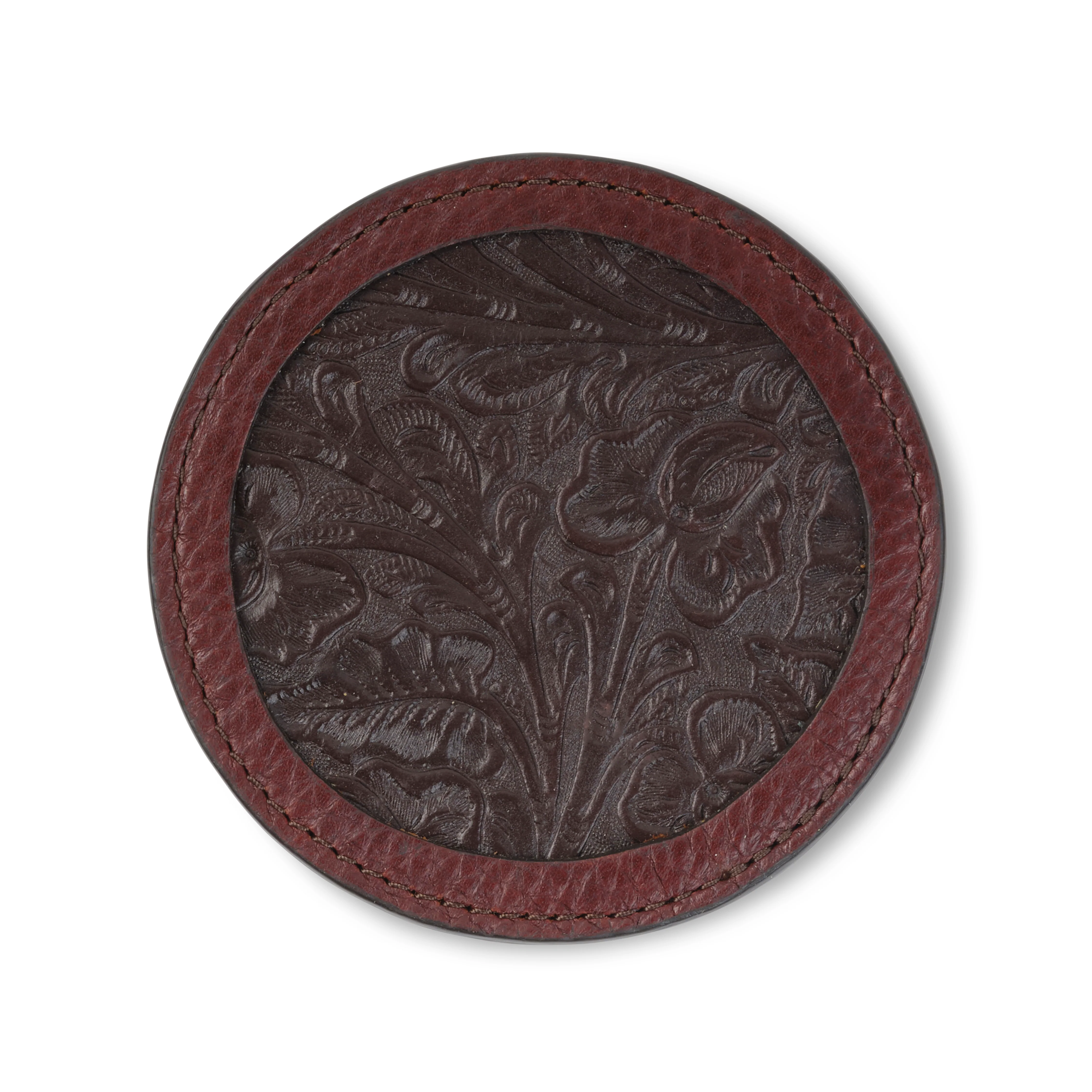 A refined take on western tradition, this set of four coasters showcases intricate floral tooling on rich, full-grain leather. Each coaster features a layered stitched leather guard to keep glassware in place, while a microfiber backing protects surfaces from scratches and condensation. Crafted for timeless durability, these coasters are part of a matching collection, making them a sophisticated addition to any home or a thoughtful gift. Whether placed on a ranch house table or in a city home with western spirit, they bring heritage craftsmanship to every pour.