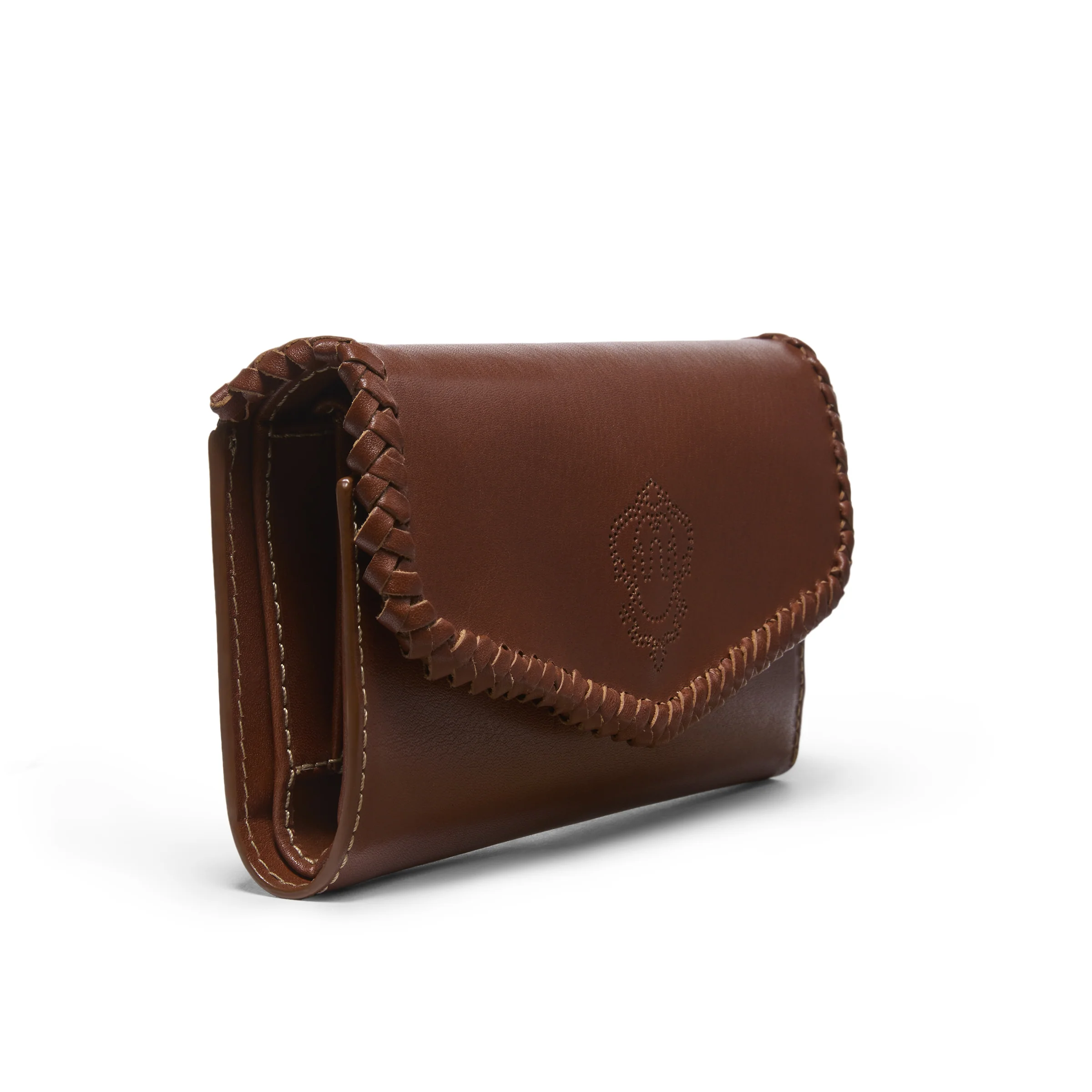 Inspired by the refined equestrian heritage that runs deep at King Ranch, this wallet blends form and function with style. The design takes cues from classic saddlecraft and the decorative Crests found in the legendary Main House. A W Crest is subtly perforated into the flap, framed by whipstitch edges that signal timeless craftsmanship. The silhouette is sleek and structured yet surprisingly lightweightâfree from linings, designed to slip effortlessly into a larger bag or carry on its own. Inside, it holds everything you need without excess: eight card slots, multiple compartments for bills and receipts, and a long snap-closure pocket for coins or essentials.