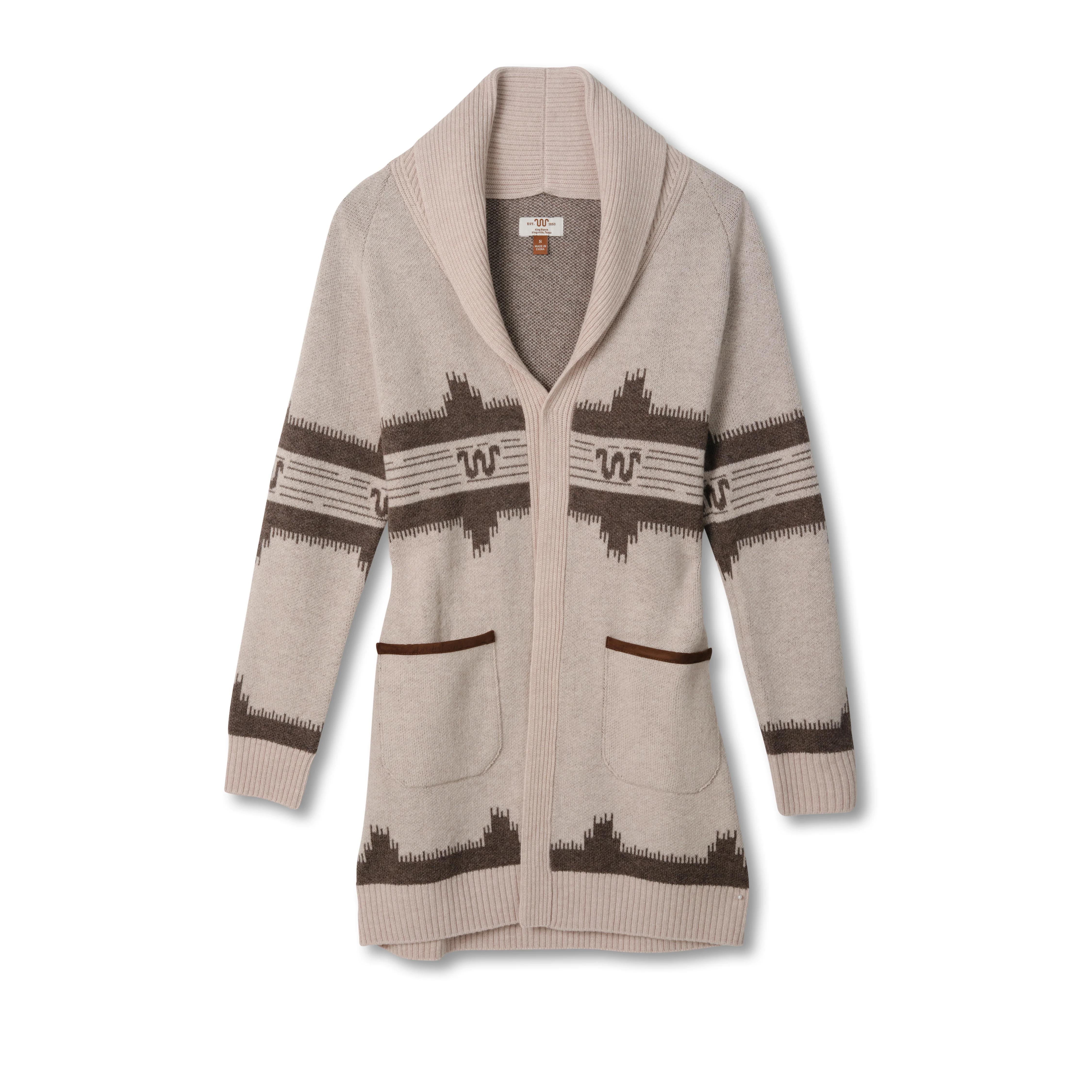 Warmth meets refinement in this heritage-inspired shawl cardigan, an effortless layer for cool mornings on the porch or evenings by the fire. Crafted from pure wool for natural insulation, it features a ribbed shawl collar, cuffs, and hem for a polished finish. Hand pockets feature sueded trim, while a genuine suede belt cinches the waist for a flattering shape and can be removed and styled with other pieces in your wardrobe. A custom Running W print is woven in as a subtle nod to King Ranch’s storied legacy, making it a versatile piece that transitions seamlessly from ranch life to town.