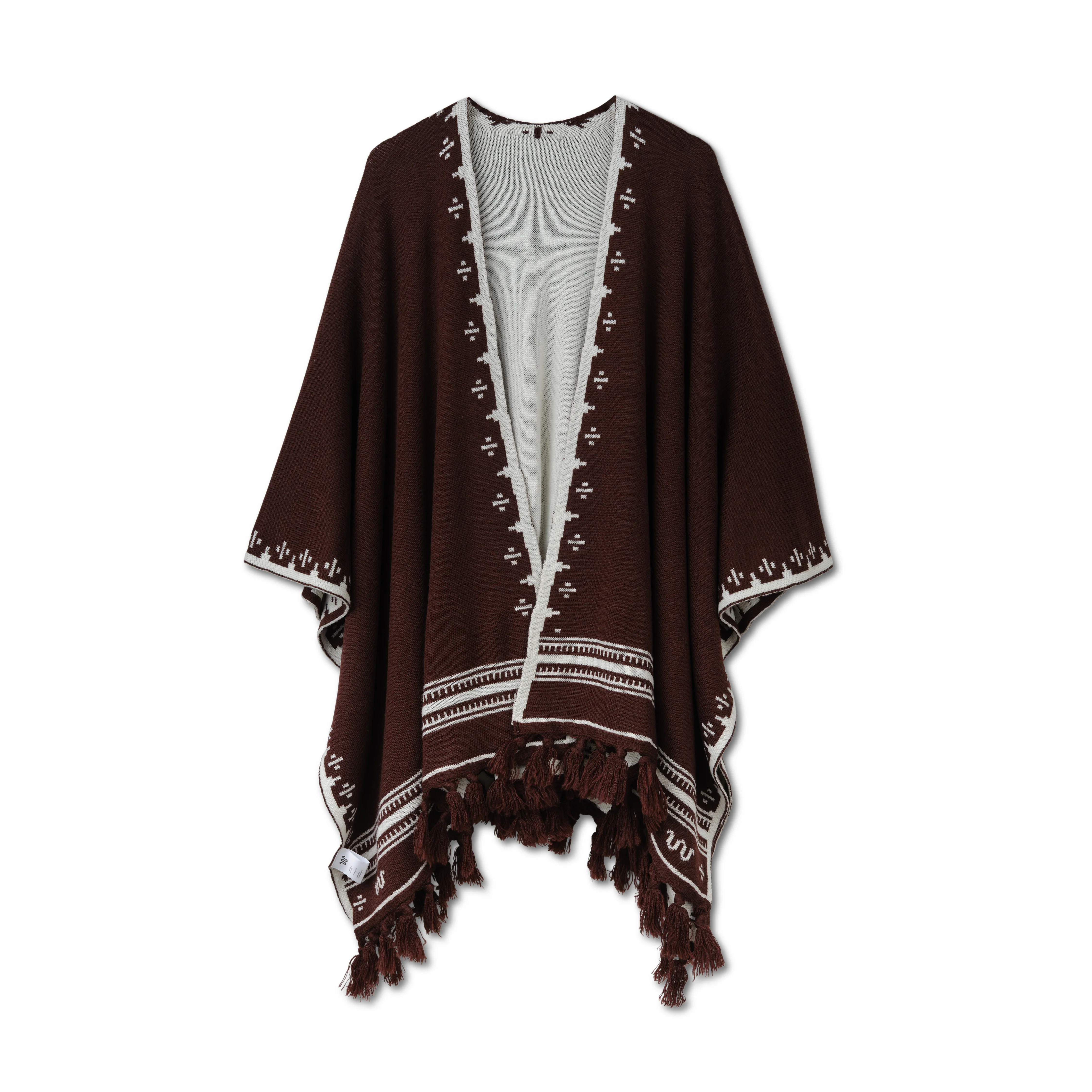 Wrap yourself in the rich heritage of King Ranch with this luxurious, reversible wrap. Crafted from pure Merino wool, this soft, lightweight wrap provides warmth while regulating body temperature, making it as practical as it is beautiful. The intricate intarsia knit design is inspired by the timeless interior details of the King Ranch main house, a subtle nod to our storied legacy where every stitch tells a story. Finished with hand-knotted fringe, this wrap seamlessly transitions from brown to cream, offering two looks in one versatile piece.