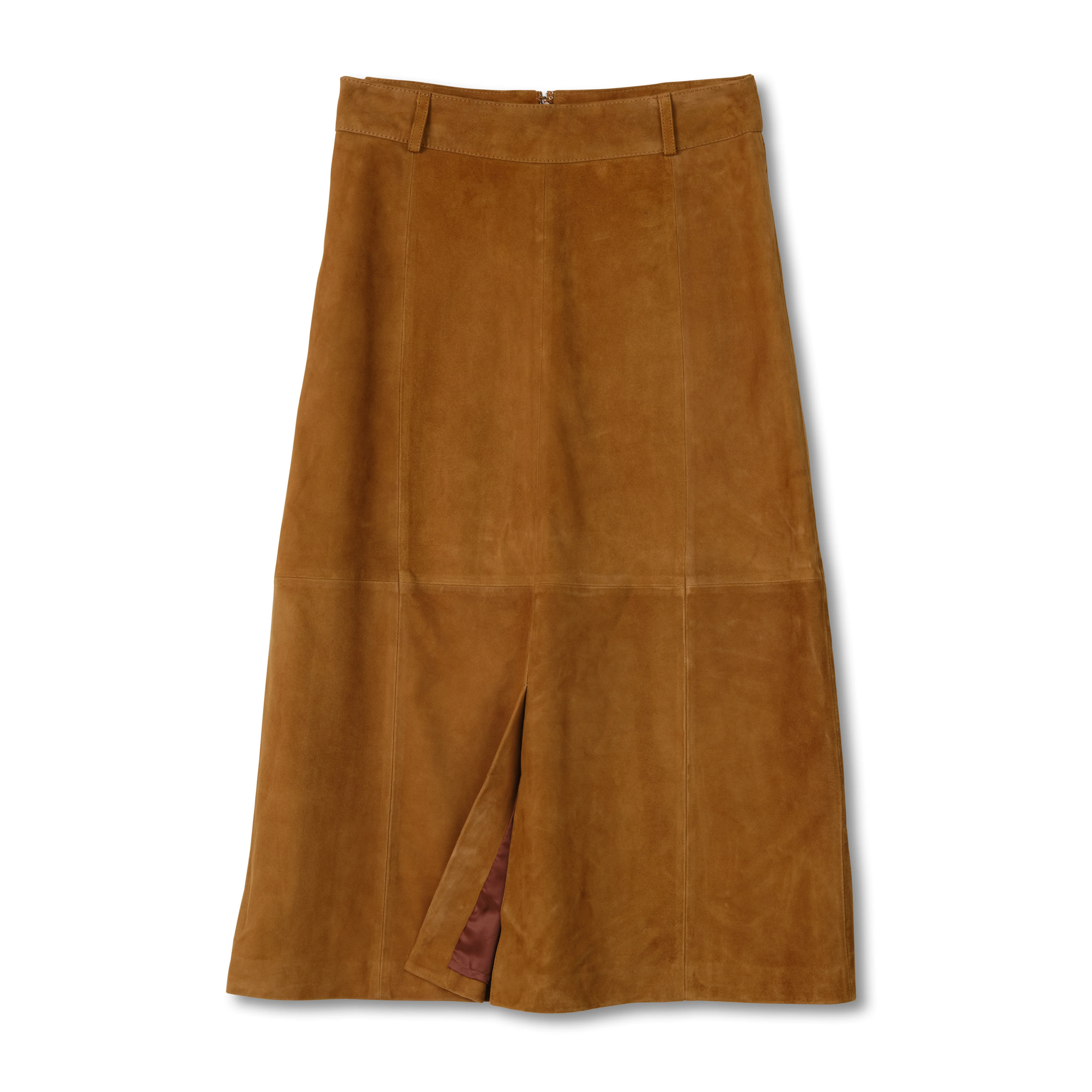 Timeless in its simplicity and enduring in its craftsmanship, this rich cognac suede skirt brings an elevated edge to ranchwear. Cut from soft goat suede and fully lined in silky fabric, it moves with quiet confidence whether paired with boots and a button-up or layered beneath a field coat on cooler days. The clean front slit adds ease in motion, while the back zip and hook-and-eye closure ensure a tailored fit. It’s a piece that speaks to heritage, femininity, and the suede that ages gracefully over time, deepening in character with each wear.